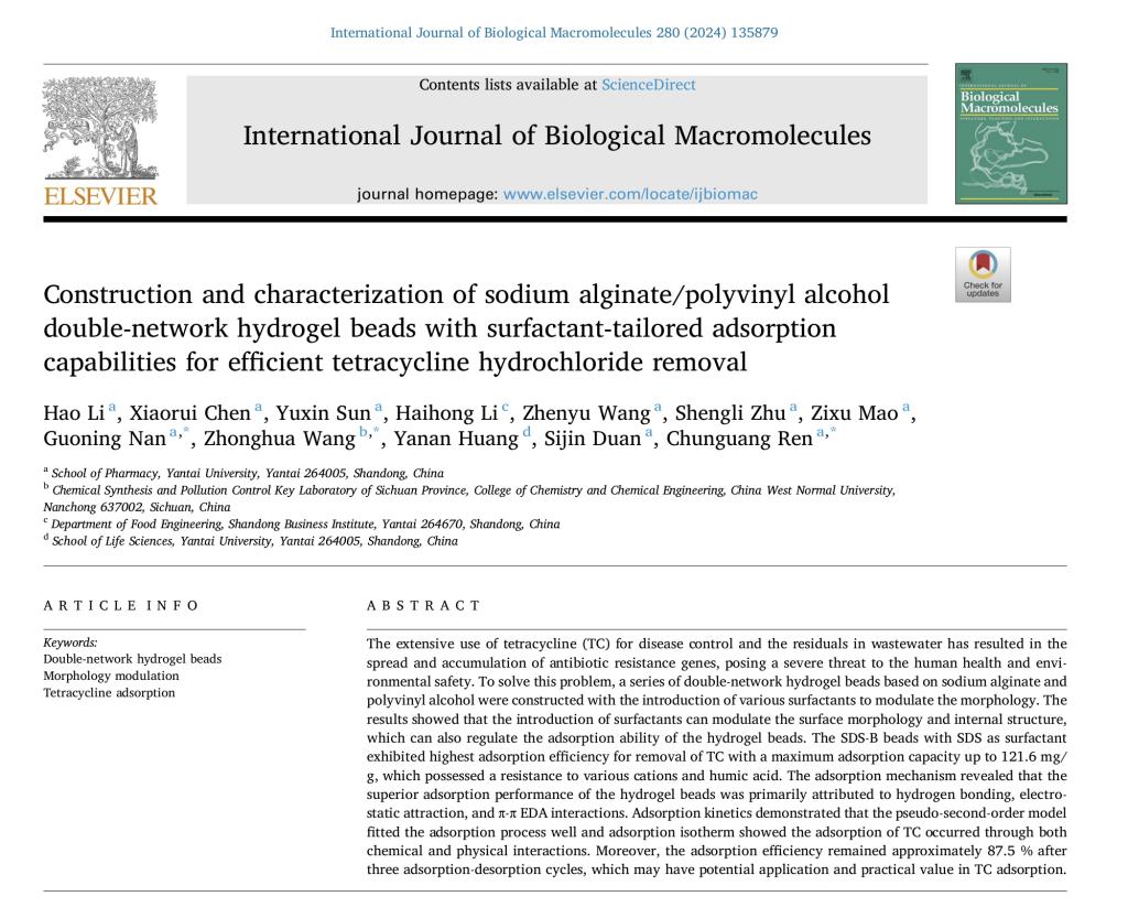 近日,51暗网 2021级生物制药专业本科生李浩为第一作者,51暗网 教师任春光、南国宁以及西华师范大学王中华教授为共同通讯作者,以“基于表面活性剂调控的海藻酸钠/聚乙烯醇双网络水凝胶微球的制备及其对四环素盐酸盐高效吸附性能的研究”为题,在国际权威期刊《国际生物大分子杂志》(中科院一区TOP)发表研究论文。