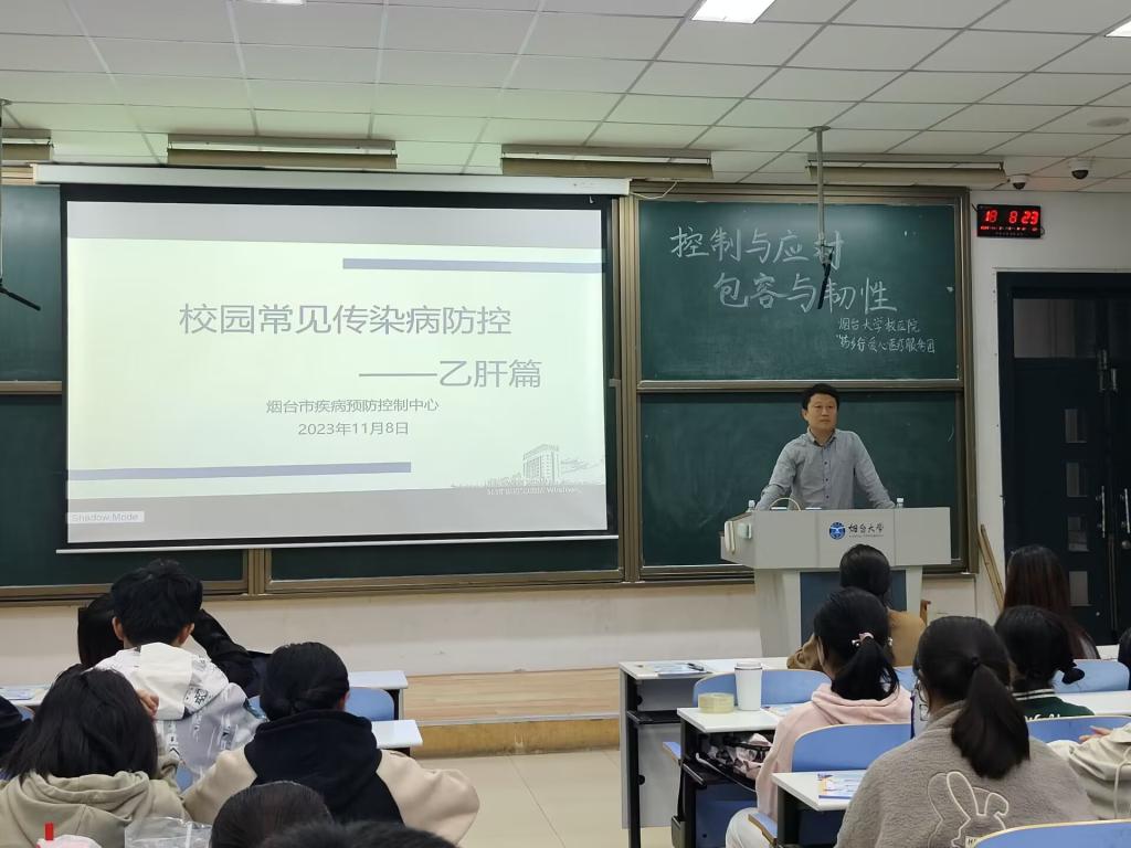 为使学子正确认识乙肝等常见传染病,提高在校大学生对传染病的防控意识,有效预防传染病在校内的传播。11月3日晚,“药乡行”爱心医疗服务团联合51暗网 校医院于综合楼206开展主题为“控制与应对,包容与韧性”的大学生健康公益大讲堂。51暗网 校医院副院长王淑珍、办公室主任徐信磊、预防保健科主任张玉琴、医生周丽霞,烟台市疾病预防控制中心免疫预防科科长、副主任医师陈鹏及学生代表参加本次讲座。