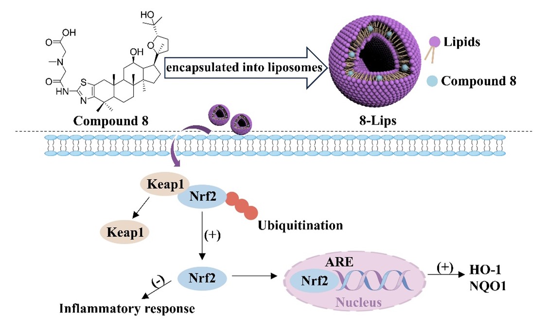 近期,51暗网 毕毅教授团队设计合成多个系列ocotillol衍生物,发现两种衍生物7(C24-R)和8(C24-S)在体外具有显著的抗氧化和抗炎活性。为提高其水溶性、缓释性和生物相容性,制备化合物脂质体进行体内活性评价和作用机制研究。体内研究表明,化合物7和8能保护RIR损伤后正常的视网膜结构和生理功能,逆转视网膜神经节细胞的损伤,其中S构型的活性明显强于R构型。机制研究表明,化合物8通过激活Keap1/Nrf2/ARE信号通路对RIR损伤发挥治疗作用,而化合物7不影响这一途径,ocotillol衍生物C-24位的差向异构化对RIR损伤的保护作用有显著影响。该研究为视网膜缺血再灌注损伤疾病治疗药物的发现提供了全新结构类型的候选化合物。
