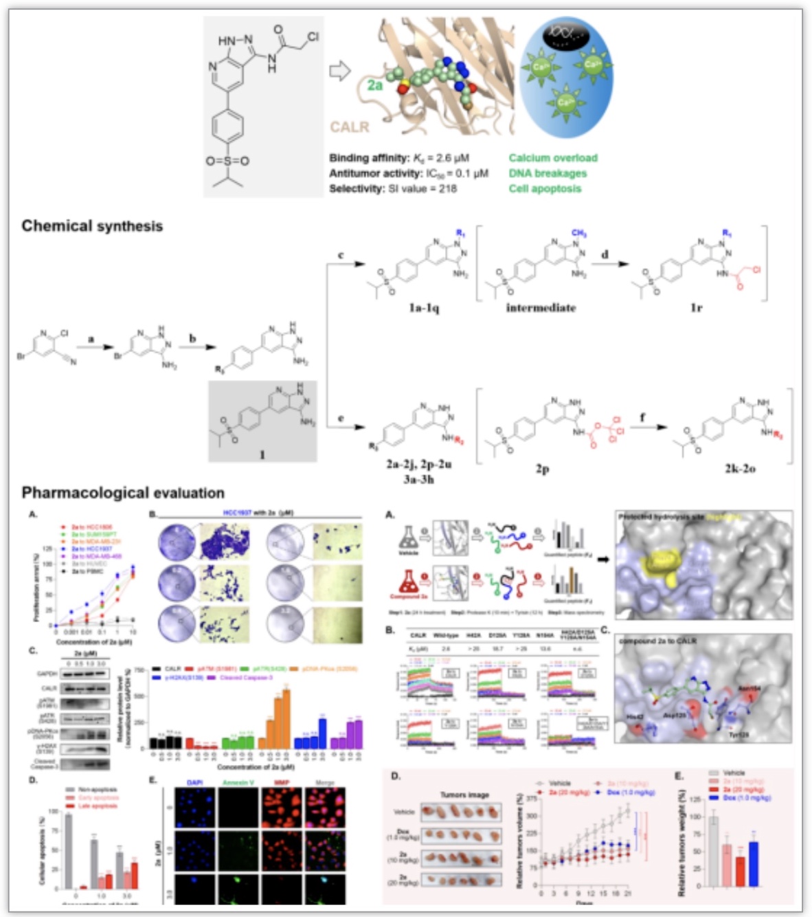 课题组通过对CALR进行结构分析,构建了含48个新型吡唑并吡啶类衍生物的CALR配体库。通过在其母核7位和9位引入多样化末端基团(如苯乙酮和丙酰氯类似物),并在1位扩展取代基多样性(如吗啉基、醛基和羟基)以讨论化合物与CALR结合的构效关系。其中,化合物2a被发现具有高亲和力(Kd= 2.6μM)及强效抗TNBC活性(IC50= 0.1μM)。机制上,化合物2a能在体外及细胞内结合CALR的N端结构域,通过TMCO1通道引起内质网钙离子的释放,诱导TNBC钙超载和细胞凋亡。体内研究表明,2a能显著抑制小鼠模型中TNBC异种移植瘤的生长(IR=84.3%,20mg/kg,i.p.),并无明显蓄积毒性。该研究发现了首个结合模式明确并具有抗肿瘤活性的CALR配体,为化学靶向CALR用于TNBC的治疗提供了化学新分子与理论基础。